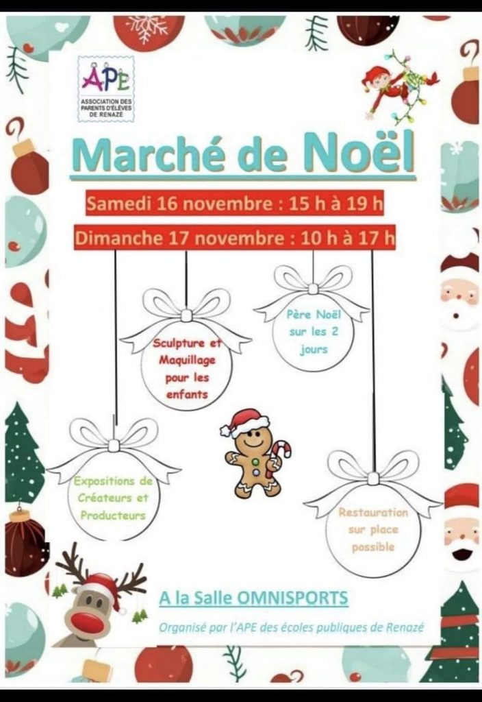 Petit cadeau et produit locaux, venez découvrir ce magnifique marché de Noël le 16 et 17 Novembre 2024 à Renazé (53). Cette évènement est organisé par l’Association de Parents d’élève de l’école de Renazé.